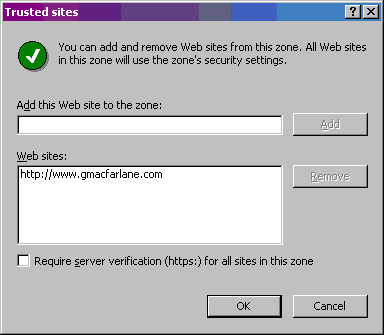 - Click on the "Sites" button and add the website "http://www.gmacfarlane.com" to the list. Make sure that the checkbox at the bottom is clear (ie, not checked), and it should look something like this before you click the "OK" button: